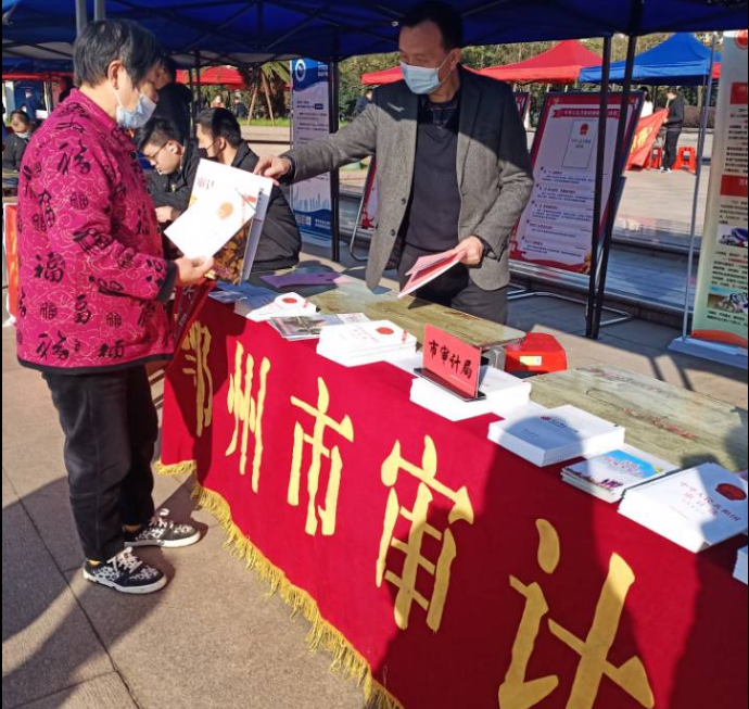 鄂州市审计局:积极参与该市“12·4”国家宪法日集中宣传暨法治文化汇演活动,现场设立“审计知识宣传台”,摆放审计知识展板,向群众发放《审计法》《审计普法宣传册》等书籍200余册。结合开展宪法进社区主题活动,向社区居民发放《百姓趣味学宪法》《民法典与生活同行漫画读本》等“口袋书”百余本,让宪法走进百姓心中,融入百姓生活。